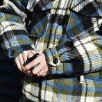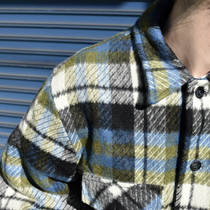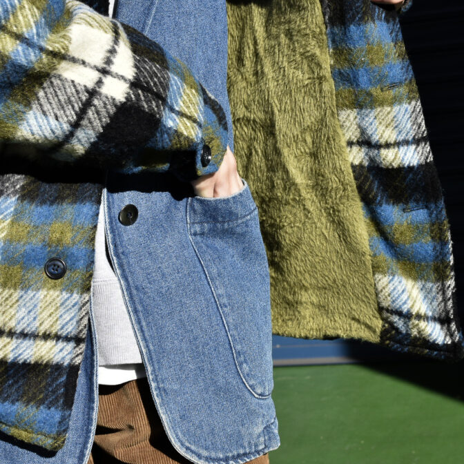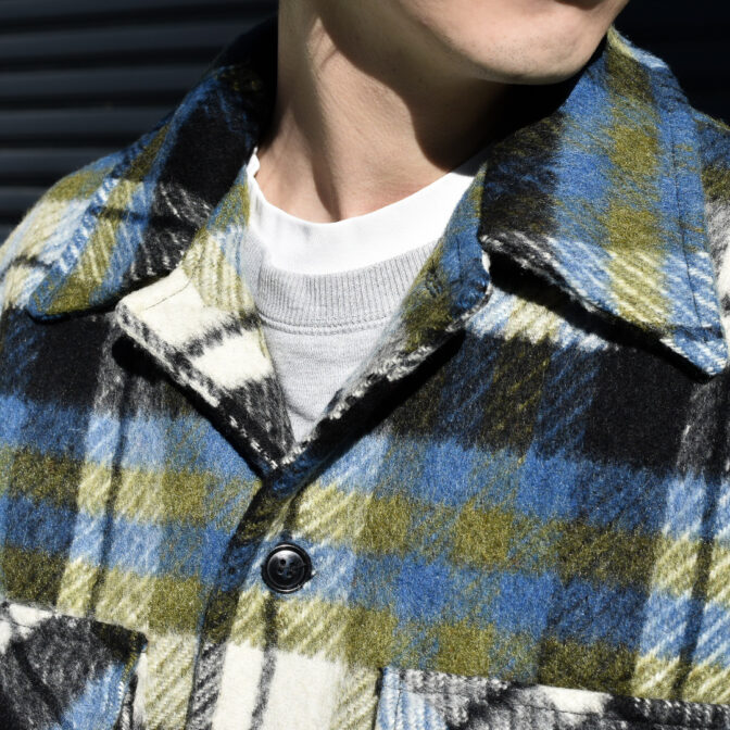 爽やかなブルーとグリーンの配色とビーバーのような毛羽立ちが目を惹くアイテム。