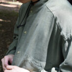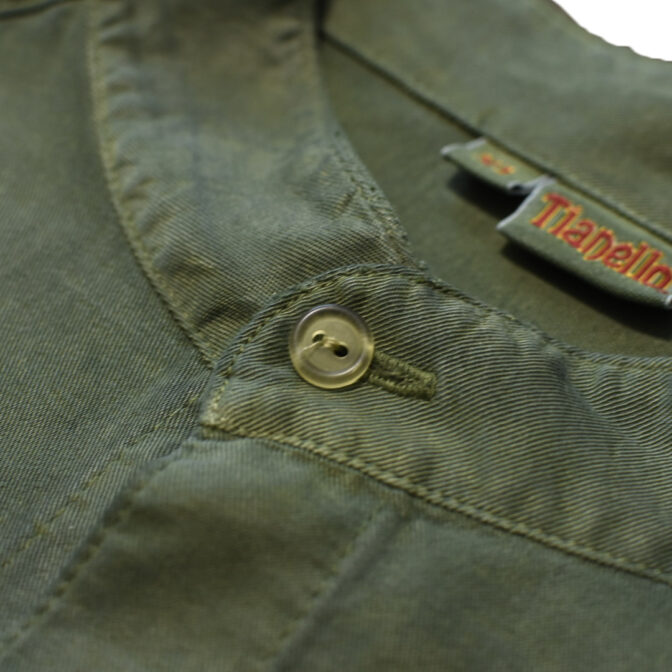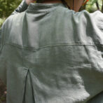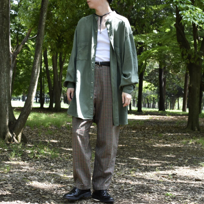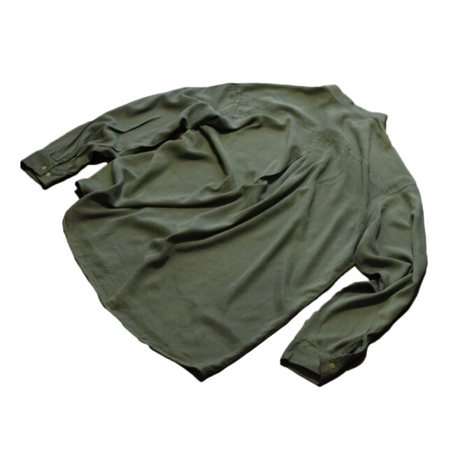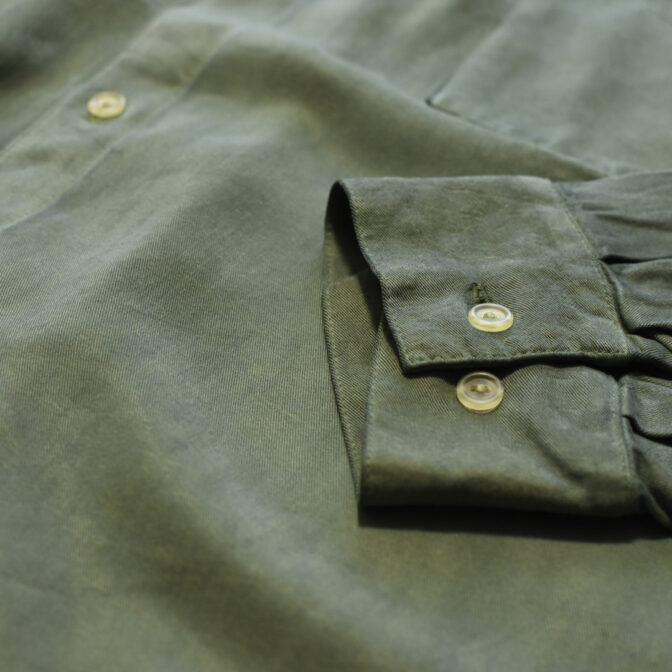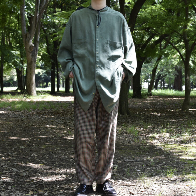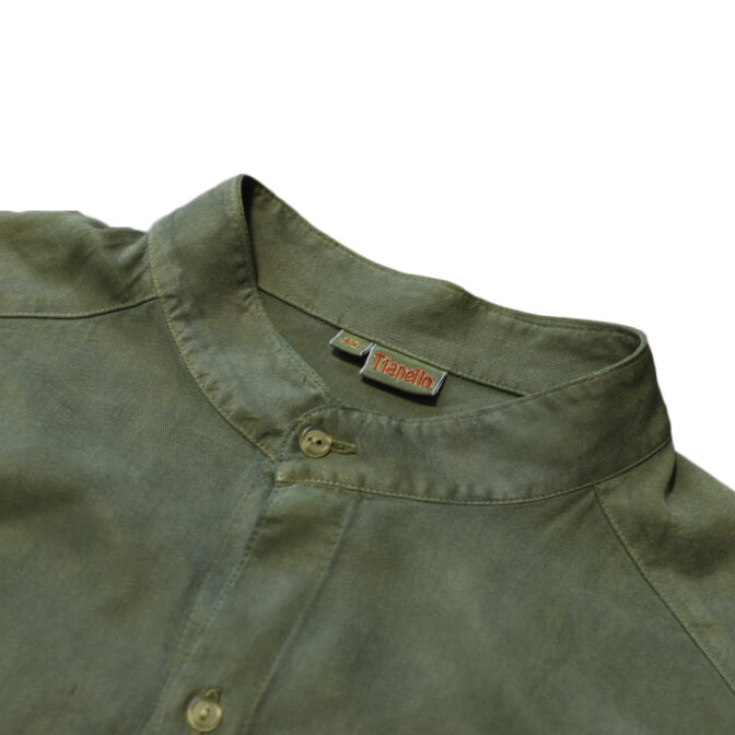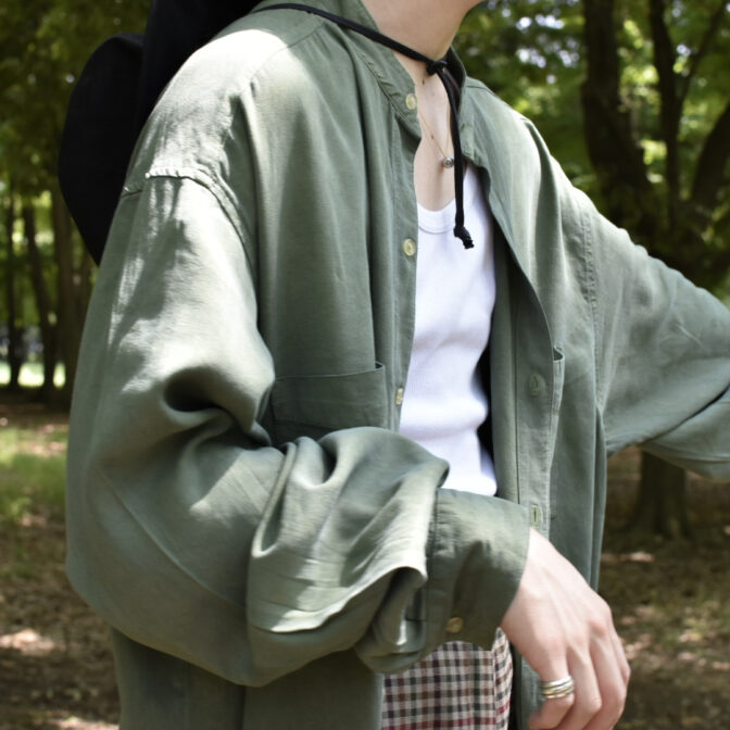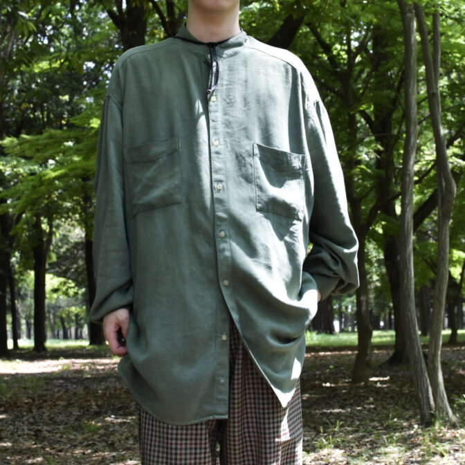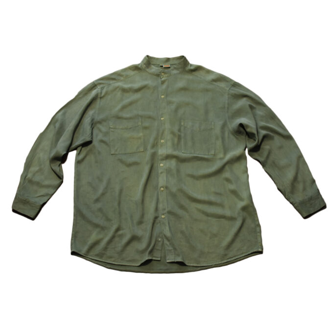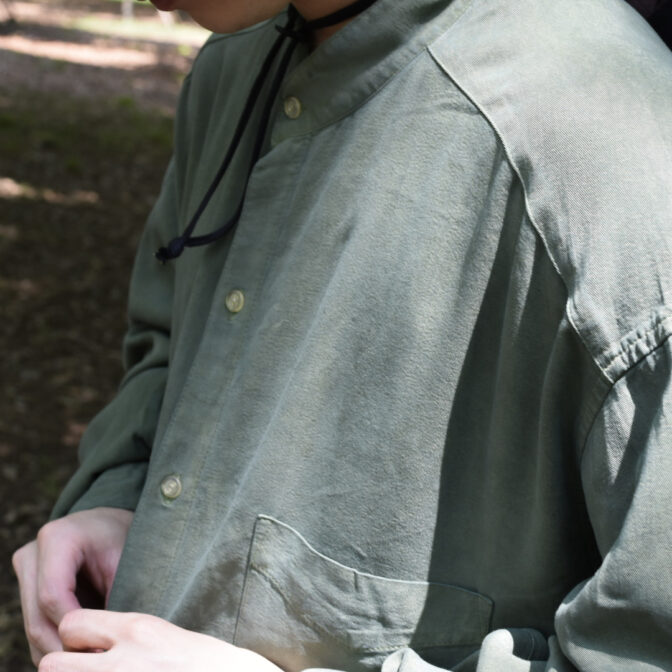 スモーキーなアッシュグリーンのスタンドカラーシャツ。