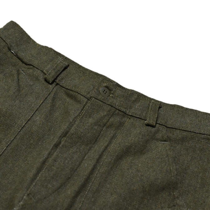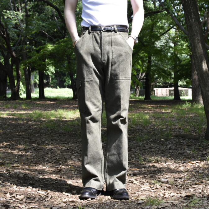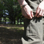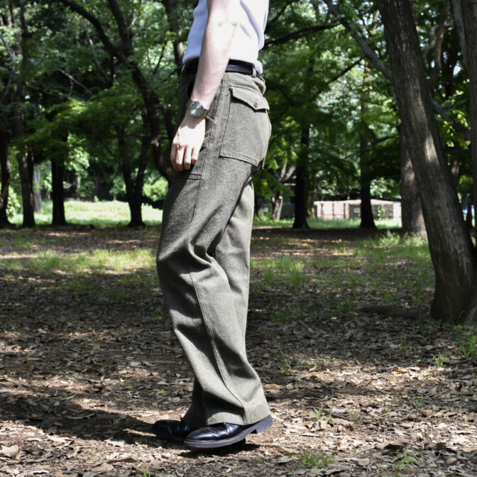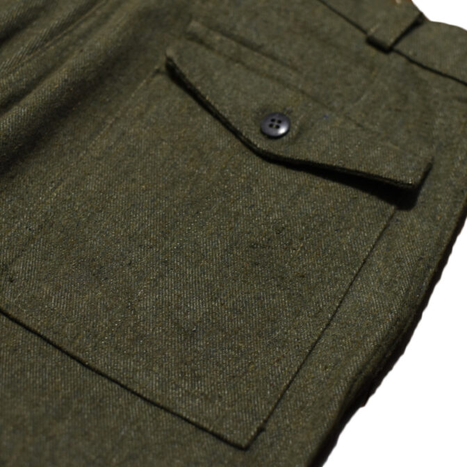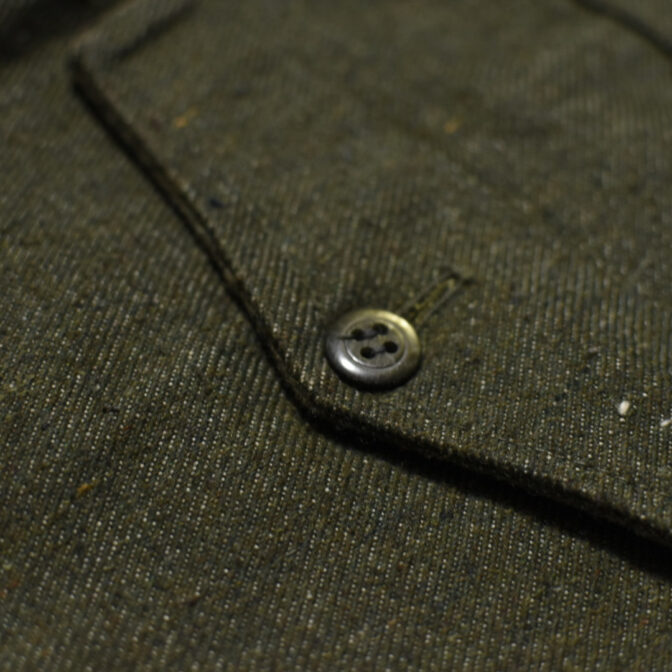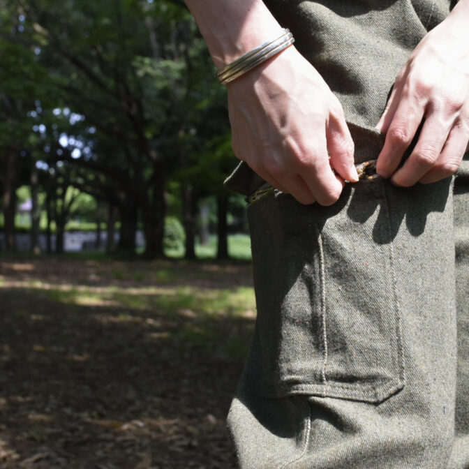 色味はカーキベースにオレンジ色が織られている点やツイル地特有の適度な光沢が絶妙。
