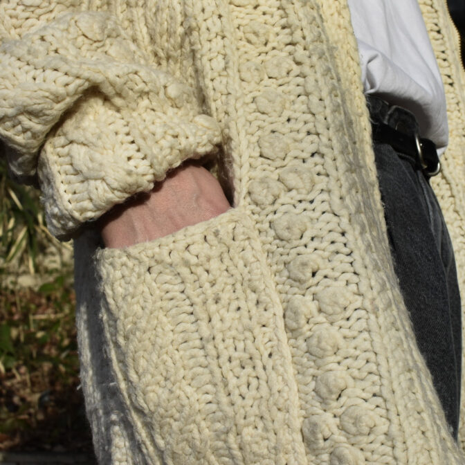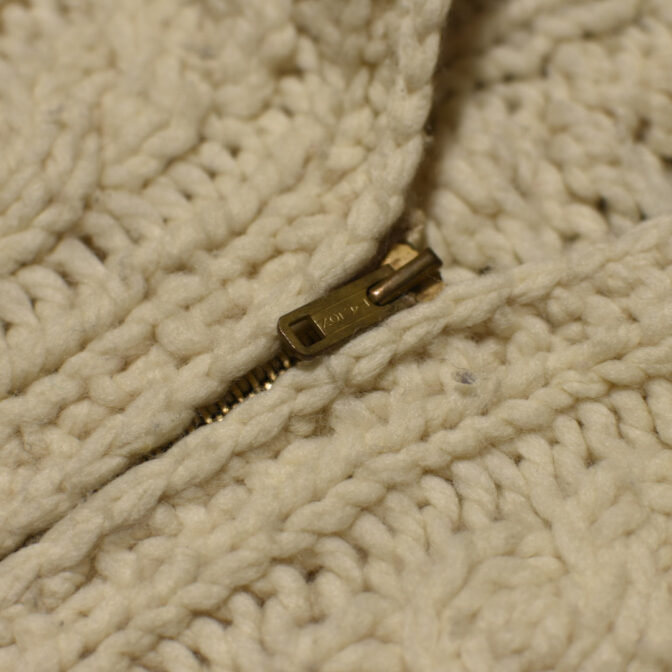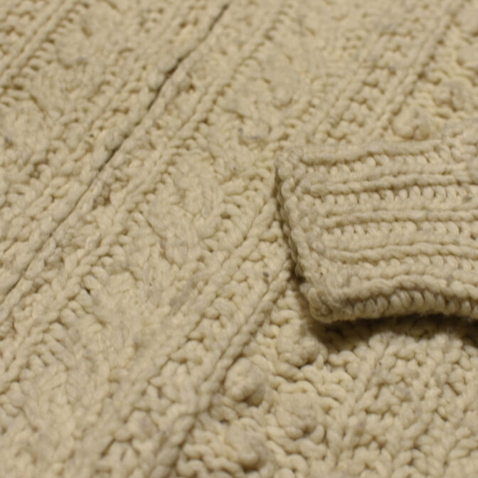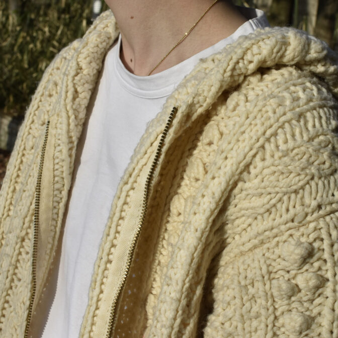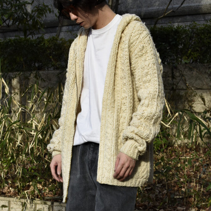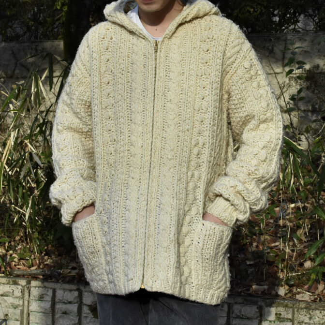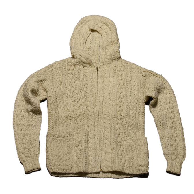 アランセーターとしてはフーディーとジップが付いており珍しいシルエットとデザイン。