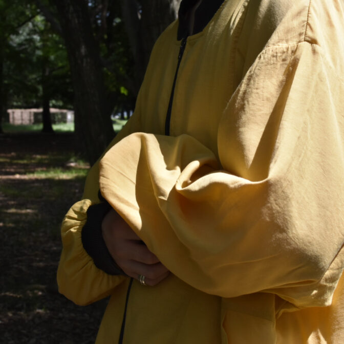 レーヨンとポリエステルの程よいハリ感とライトな素材感と爽やかなカラーが特徴。